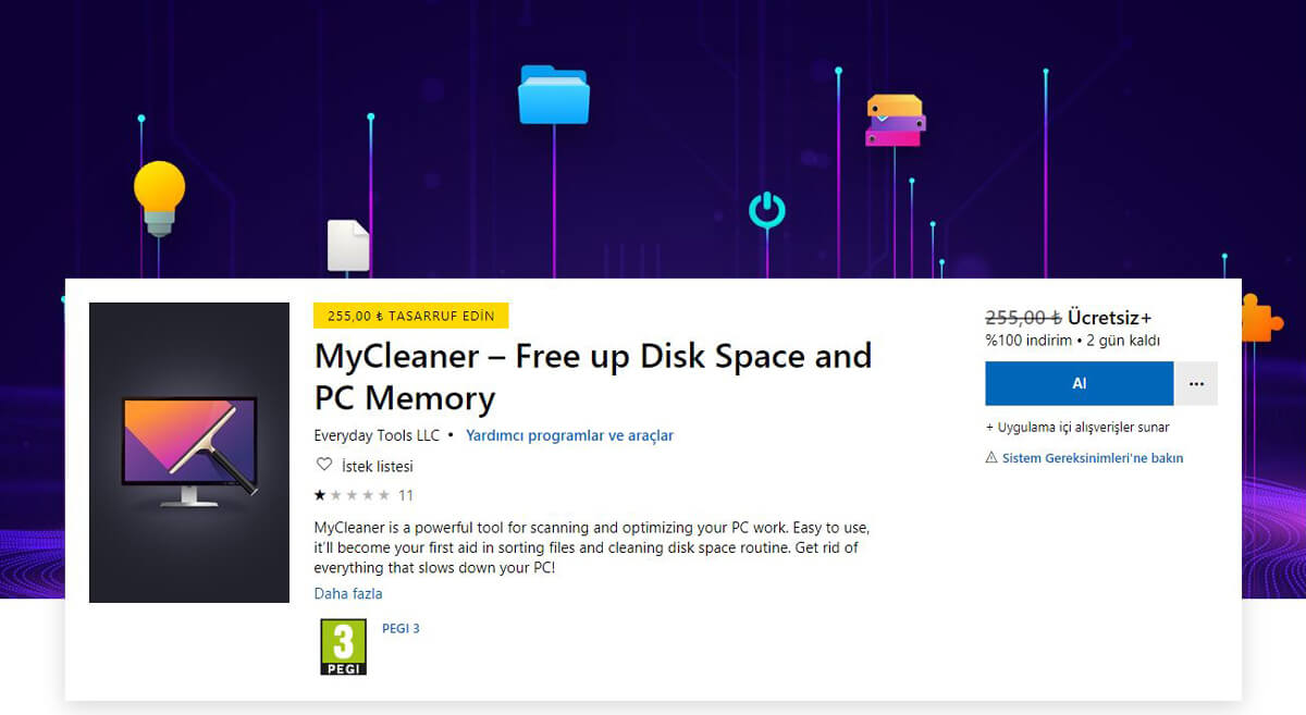 MyCleaner, Microsoft Store’da bulunan Everyday Tools LLC tarafından sunulan bir Windows 10 uygulamasıdır. Uygulama PC’nizi optimize etmek için güçlü bir araçların biri. Disk alanını ve PC belleğini boşaltmanıza yardımcı olur.
