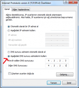 İnternet Protokol sürüm 4 (TCP/IPv4) özelliklerine tıkladıktan sonra gelen sayfadan “Aşağıdaki DNS sunucularını kullan” seçeneğini seçiyoruz. Sonrasında kullanmak istediğimiz DNS’leri ya da resimdeki DNS’leri yazıyoruz ve Tamam seçeneğine tıklıyoruz. Windows 7 işletim sisteminde DNS değiştirme işlemi bu kadar.